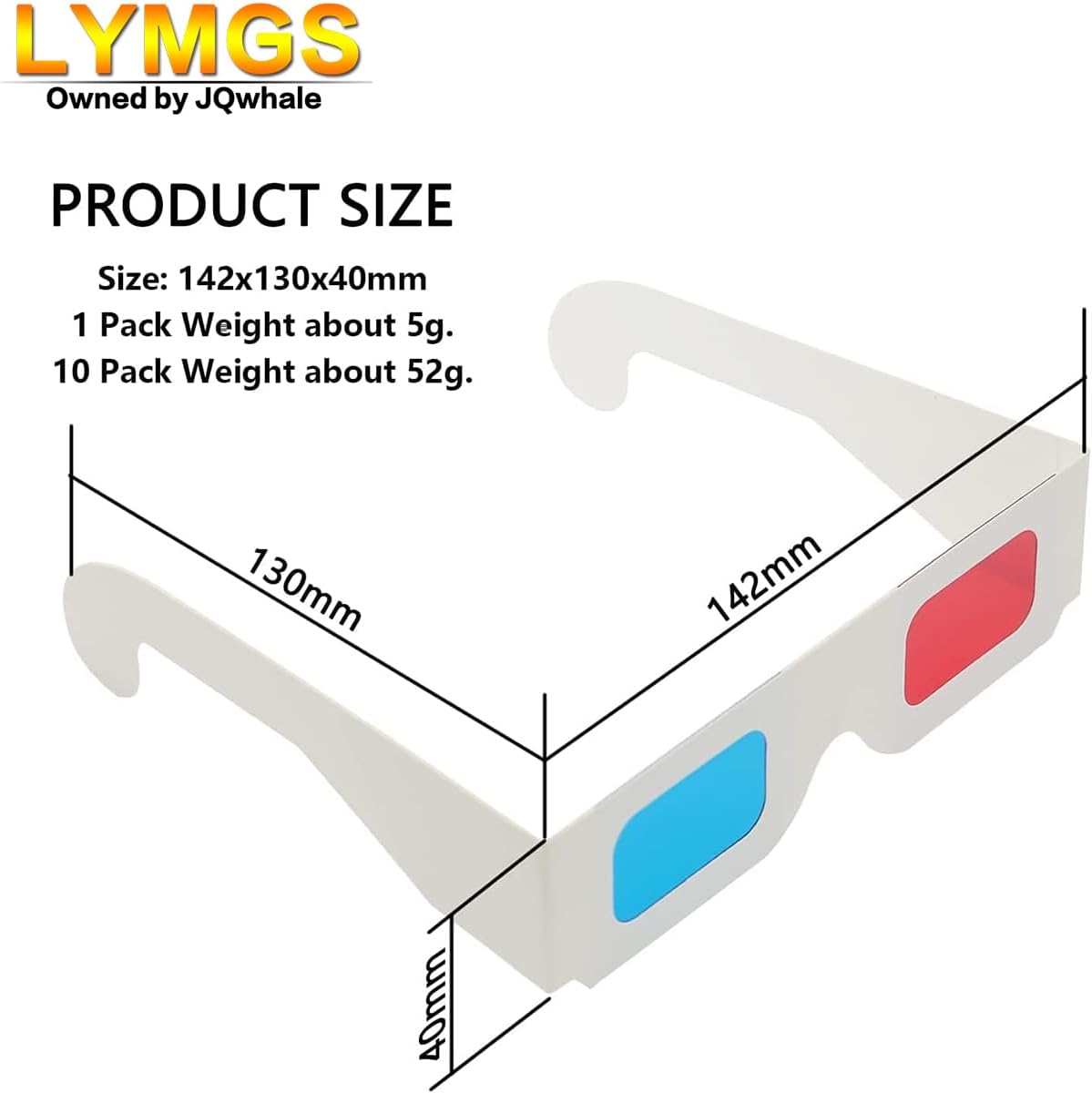 PRODUCT DETAILS – Brand: LYMGS; Owner: JQ Whale; Material: Paper Card; 3D Style: Red / Cyan; Size: 142x130x40mm / 5.59×5.12×1.57in; Package Inclues: 10 Pairs; Weight: About 52g.