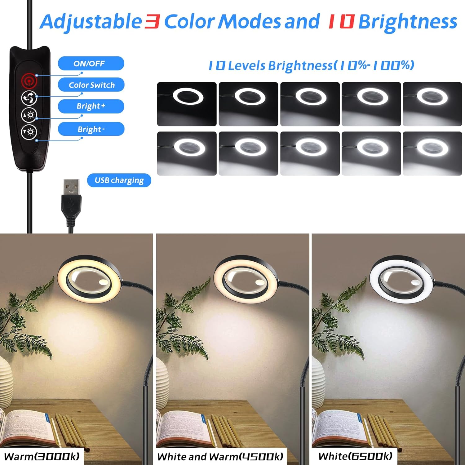 [3 Color Lights and 10 Brightness Levels] Desk magnifying glasses with 72 LED lights, simply will be adjusted between 10%-100% of brightness by means of the button. 3 totally different color modes( 3000K, 4500K, 6000K) to select from in response to your desire and setting.