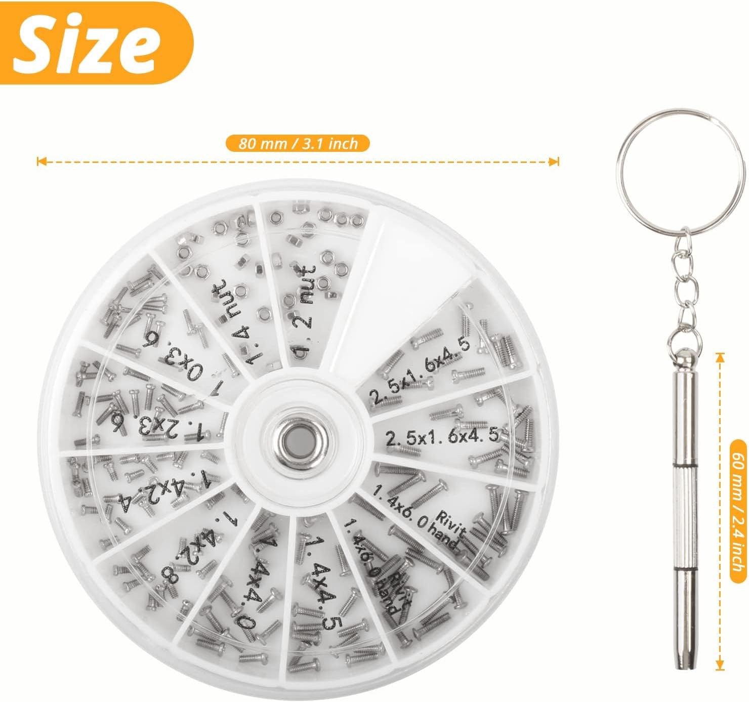 The versatile and practical package includes a 3-in-1 multifunctional eyeglass repair screwdriver with flathead/crosshead/nut driver, alongside different sizes of screws and nuts, making it suitable for an array of tasks such as repairing eyeglasses, sunglasses, watches, jewelry, smartphones, and electronic devices.
