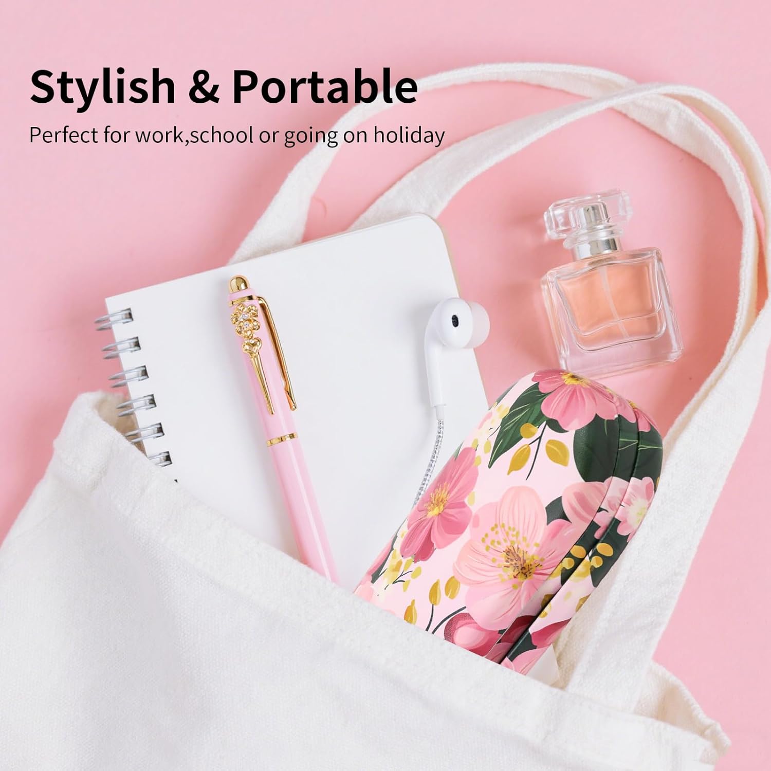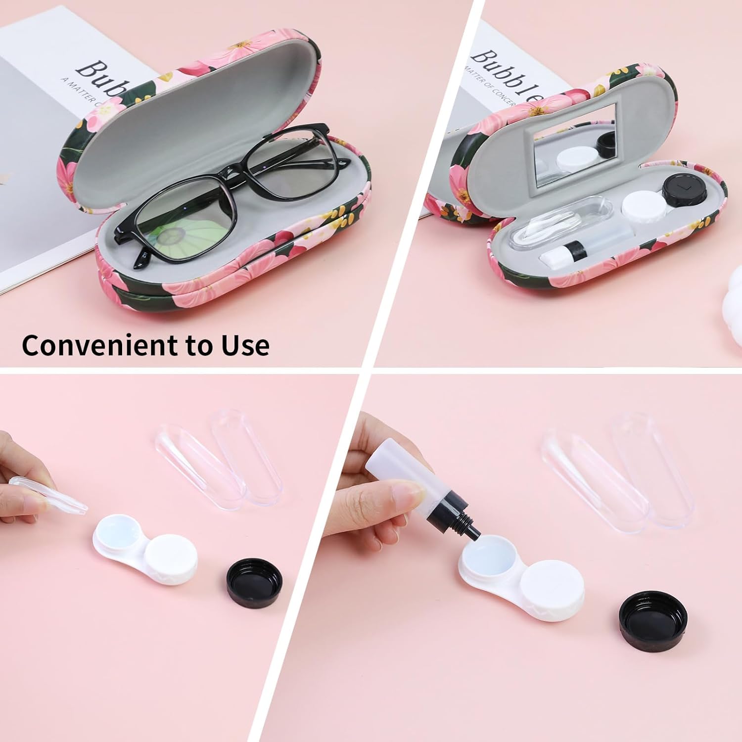 2 in 1 Contact Lens Case and Eyeglasses Case for Women Men Kids, Double Sided Hard Shell Portable Glasses Travel Holder with Built-in Mirror, Contact Lens Box Storage Kit (Pink Flower)
