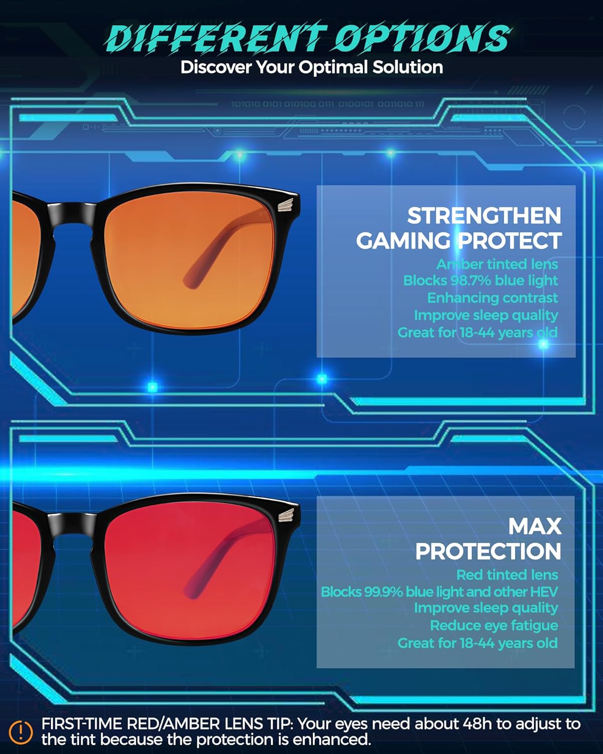Take Your Game Further with Vbewo’s Red Lenses – Vbewo’s upgraded red lenses block 99.99% of harmful blue light while enhancing contrast and visual clarity. Enjoy smoother gameplay with less eye strain, and stay focused—whether you’re deep into a game or working long hours at your desk