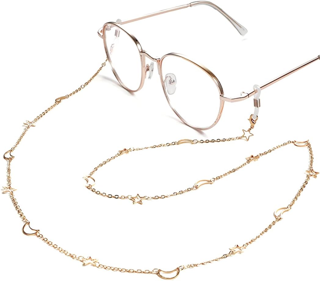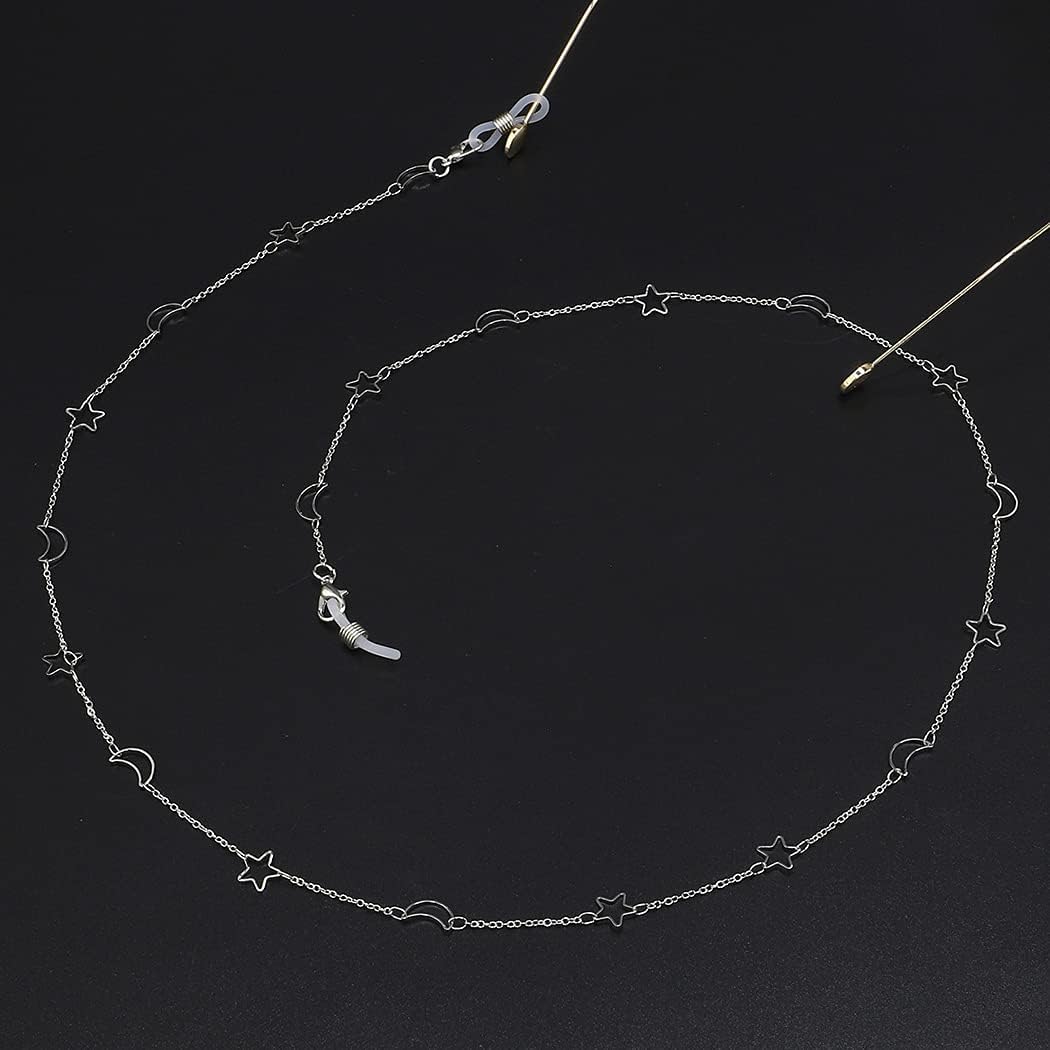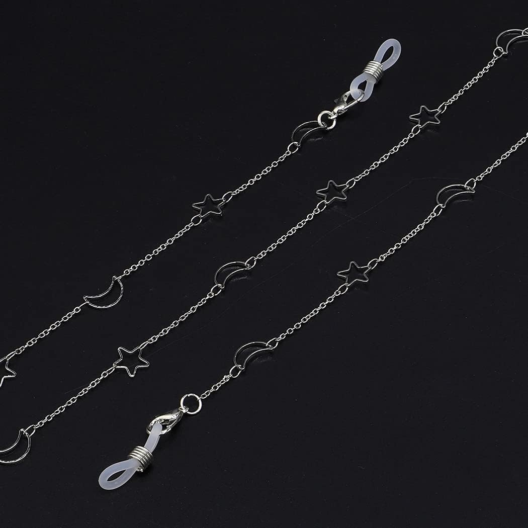 2PCS Eyeglass Chain Sunglass Strap Holder Reading Glass Cords Lanyard Necklace Eyewear Retainer Metal Long Necklace Accessories with Rubber Ends –Style Star and Moon
