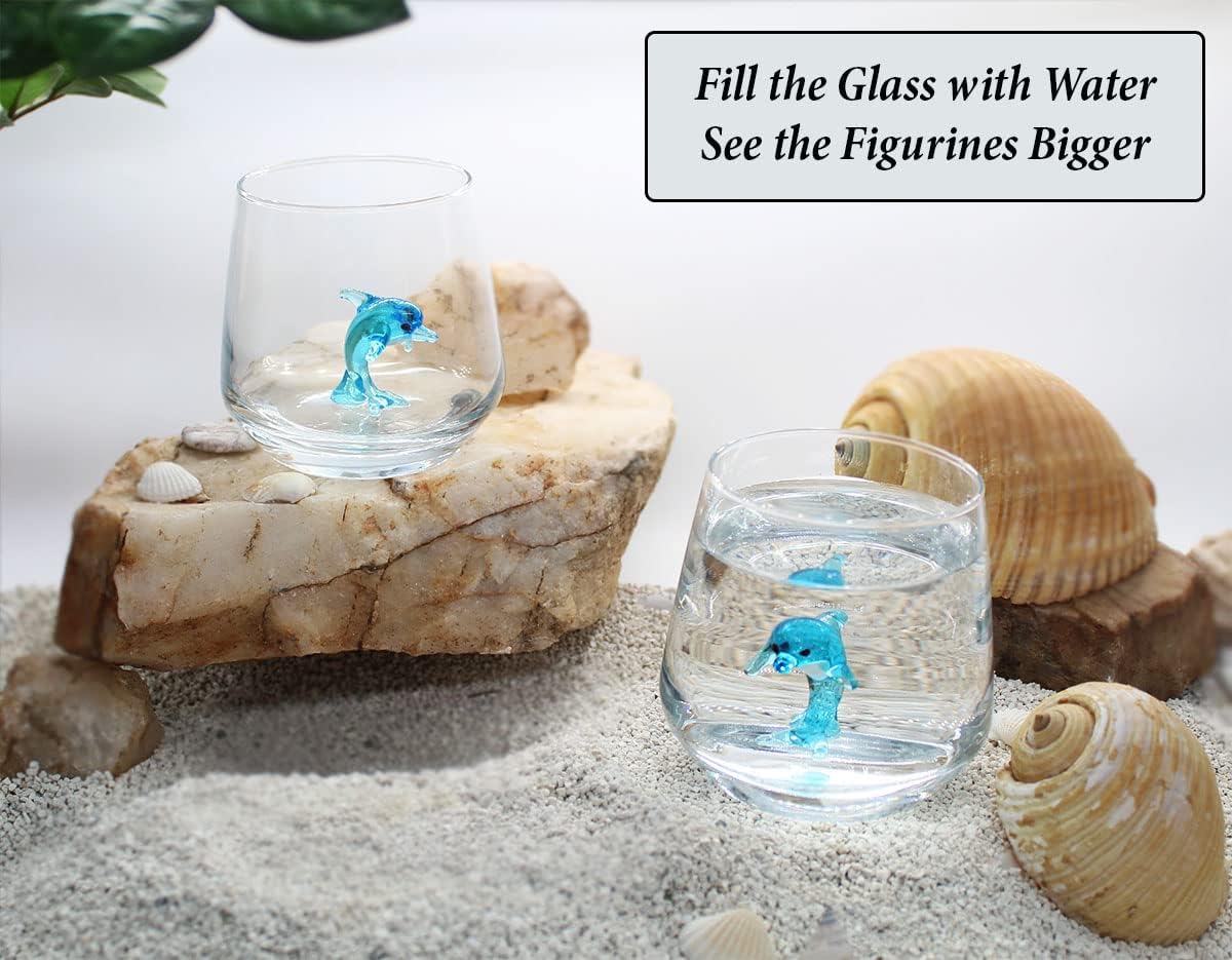 3D Drinking Glass Cup with Cute Animal Figurine Inside, Hand Blown Glass Dolphin Figures Inside Mug, Stemless Glass for Wine, Water, Milk, Beverages, 12oz(Dolphins)