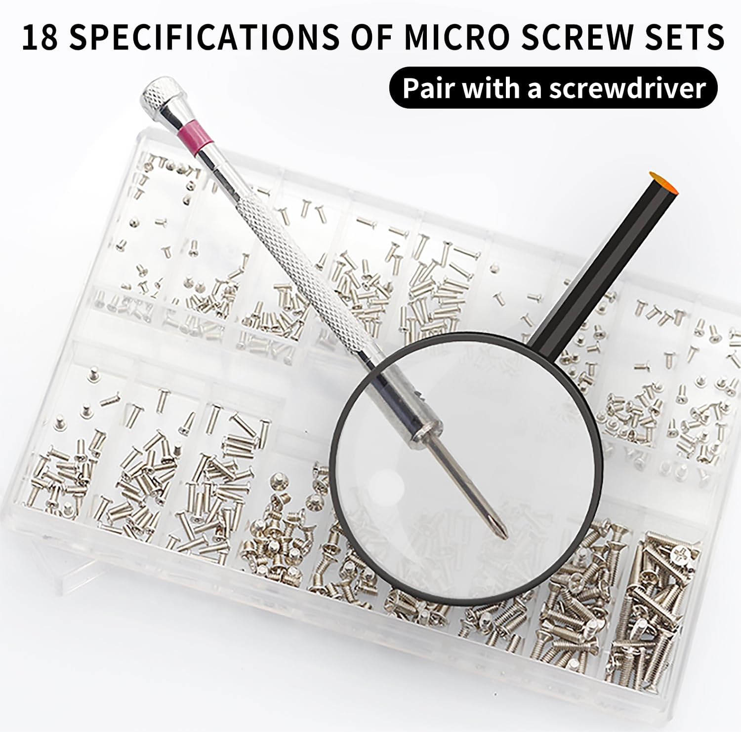 Complete Kit, No Tweezers Needed: 630 silver stainless steel micro screws (18 sizes) + 1 precision screwdriver. Perfect for repairing eyeglasses, sunglasses, watches, jewelry, phones, and small electronics.