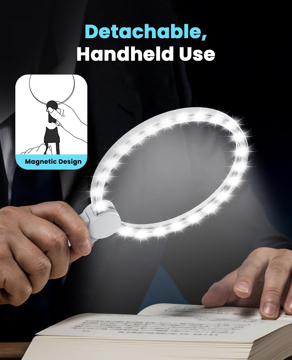 5X Hands Free Magnifying Glass with Light for Close Work,Neck Wear Magnifier for Reading Books,Sewing, Cross Stitch.Low Vision Seniors with Aging Eyes(White)