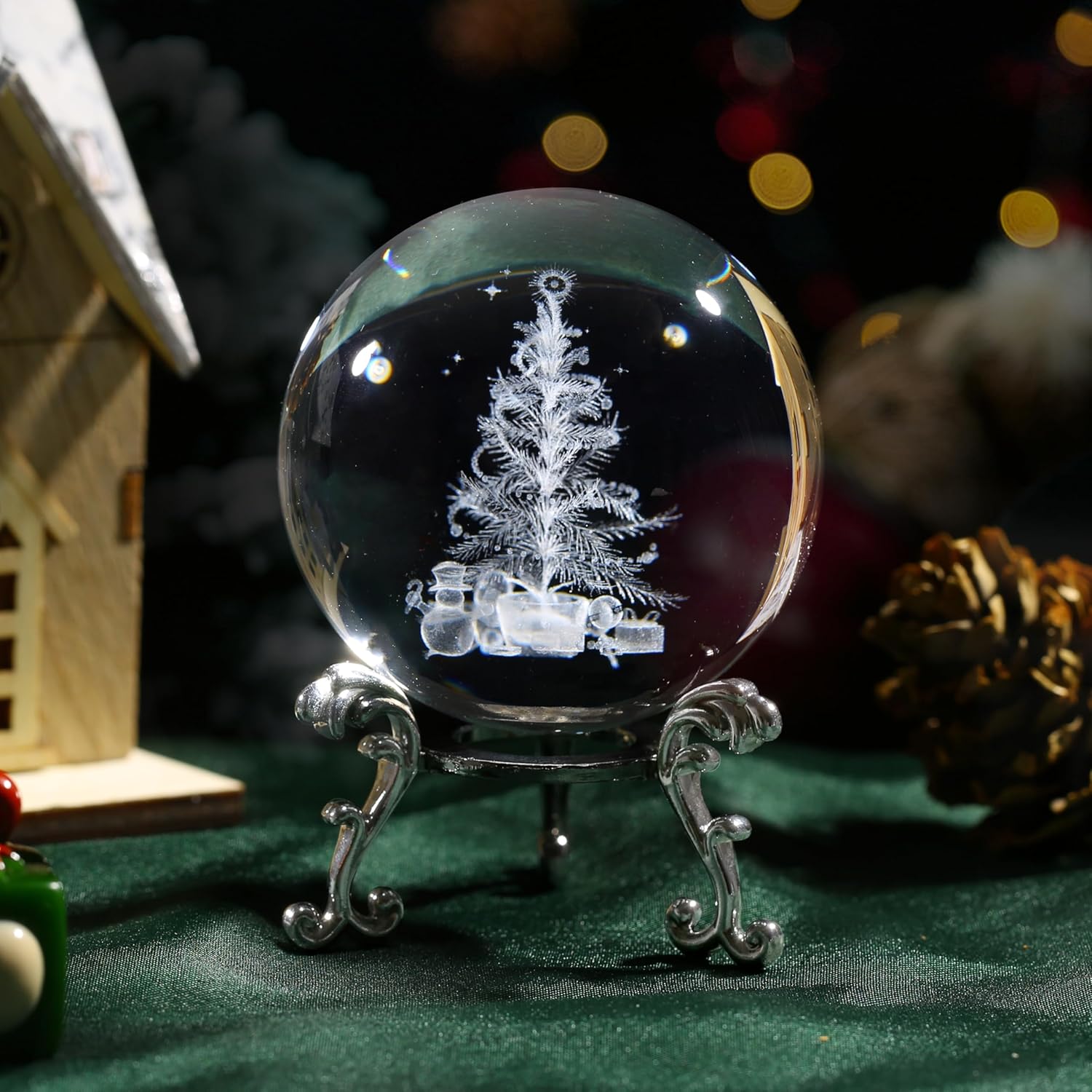 60mm 3D Laser Christmas Tree Crystal Ball with Stand Glass Christmas Ornament Decoration for Home