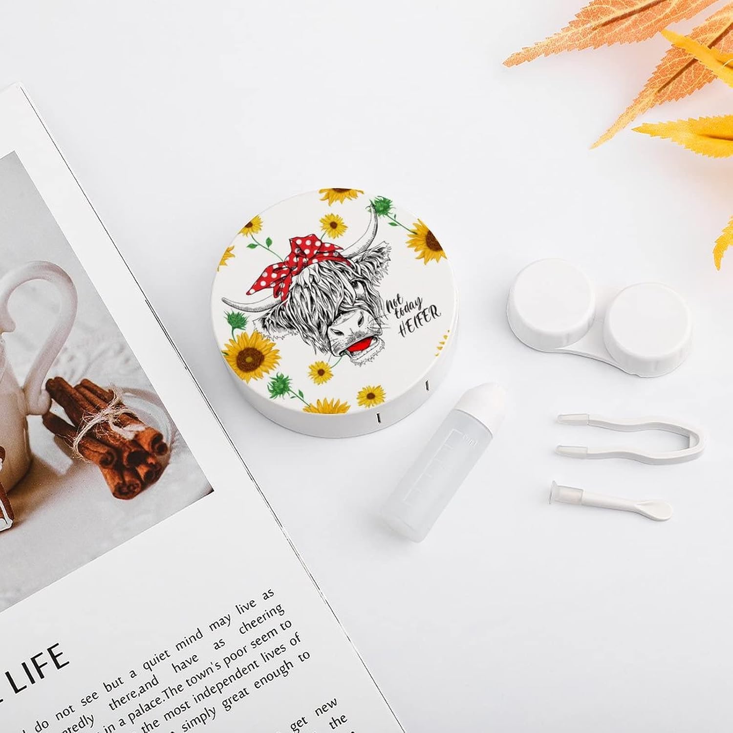 Cow Sunflower Heifer Contact Lens Case Holder with Mirror, Tweezers, Lens Cleaner Solution Bottle, Portable Travel Kit