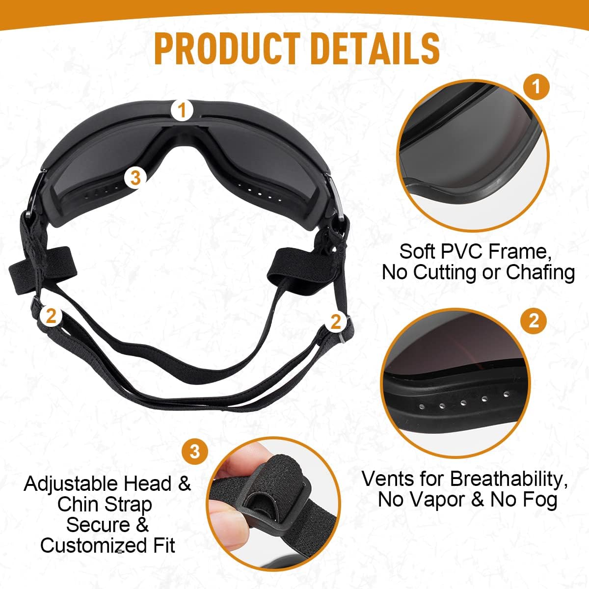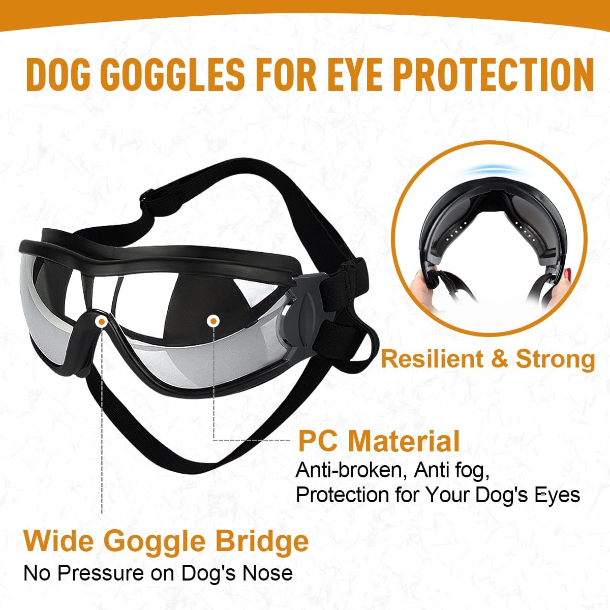ADJUSTABLE & SNUG FIT: The dog goggles have adjustable nylon head strap and chin strap with high elasticity, which can be adapted to fit the size and shape of your dog. Once adjusted to a suitable length, the dog glasses can stay in place, will not fall off even when your dog is running.