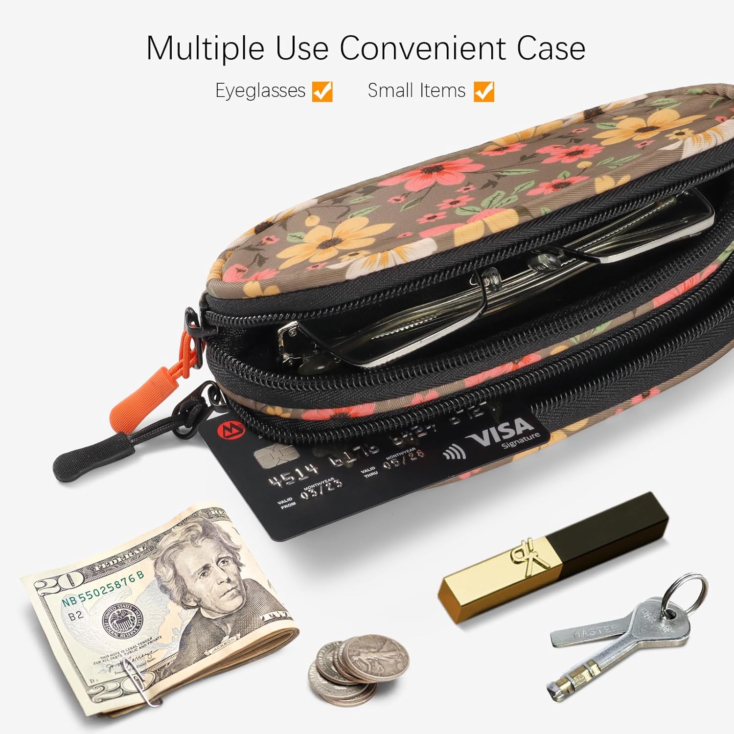 Customers find the eyeglass case fits well, accommodating larger sunglasses and being easy to carry in a purse. The case is sturdy, soft, and has a smooth zipper, with one customer noting the zipper adds structural support. They appreciate its storage capacity, with one mentioning it’s great for travel, and they like its attractive design.