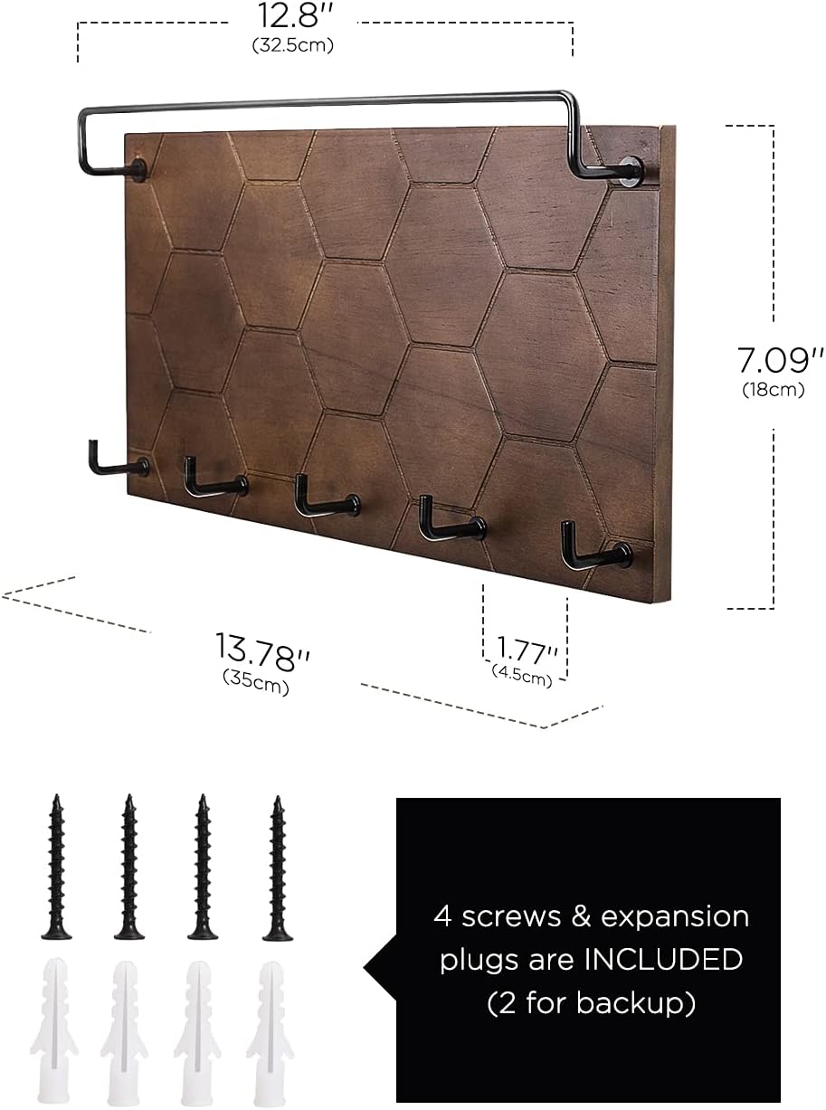 Ornamental Wall Organizer: Our key organizer wall mount has a country darkish walnut look with a hexagonal sample engraved on the floor, which makes the unique uninteresting wooden extra elegant and can complement any room decor.