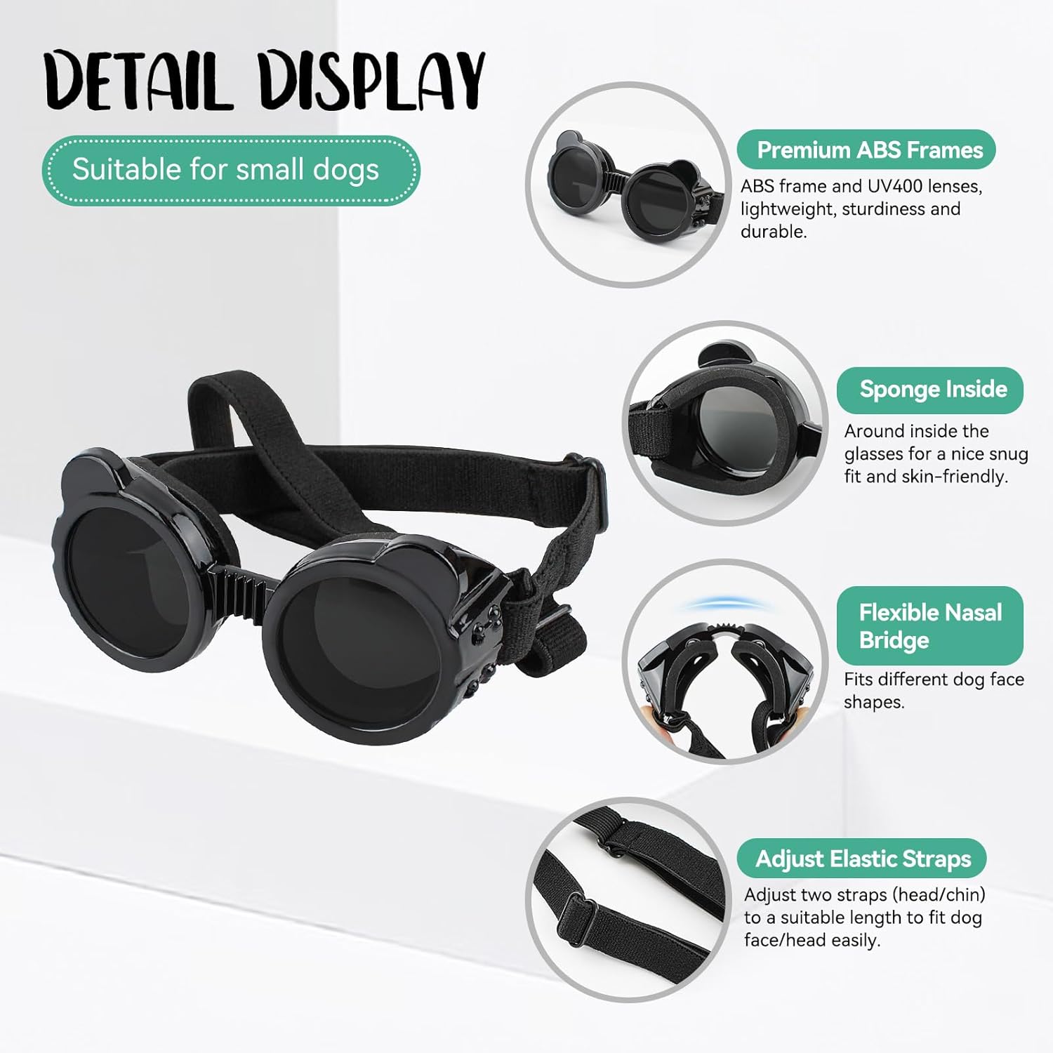 Inner soft padding and deeply eyecups are very friendly to the eyes of pets, with the adjustable head and chin straps can be well fixed the glasses on the dog’s face