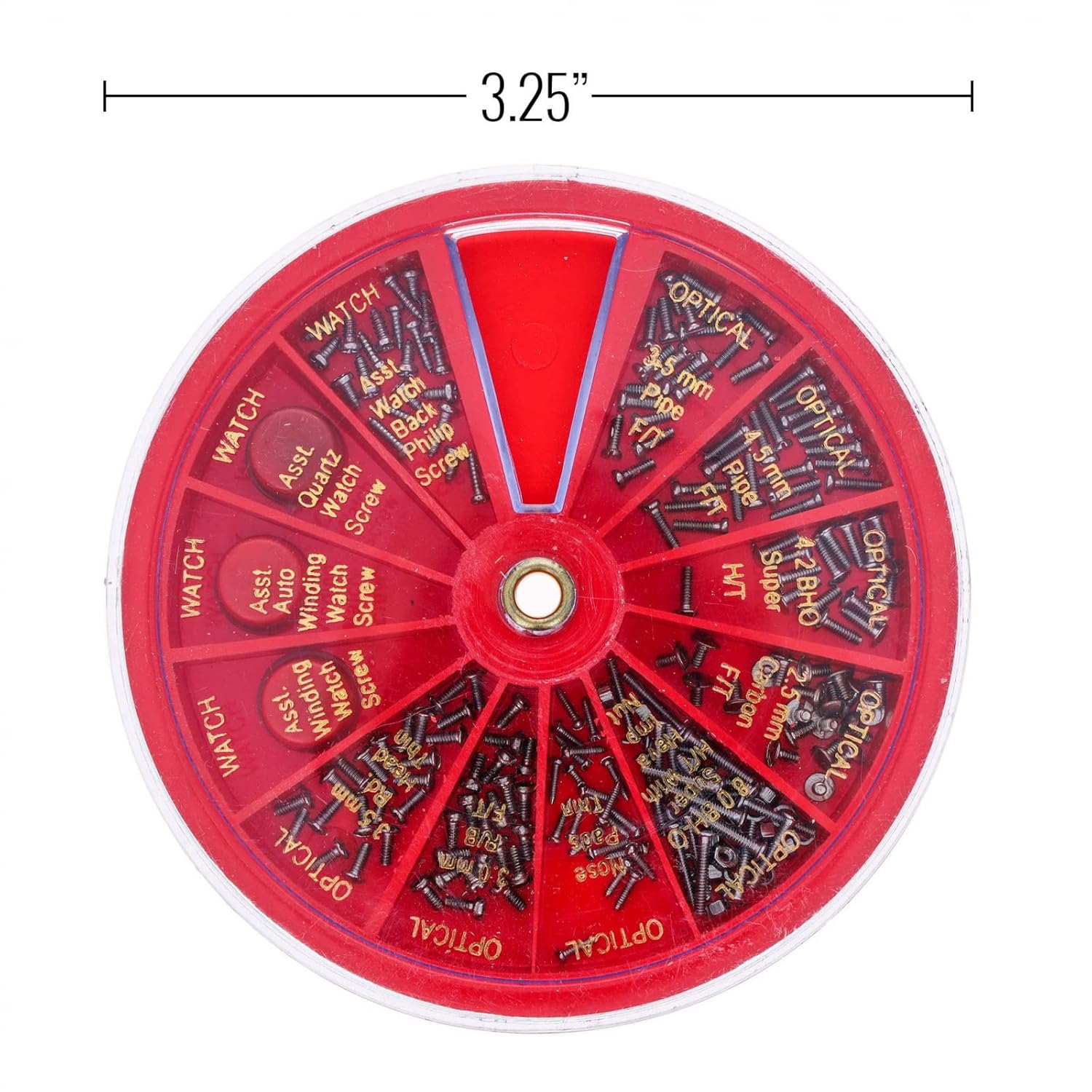 SPECIFICATIONS – Materials: steel; plastic case; Measurement: 250 items; Optical and watch restore screws; Dimensions of storage case: 3” x 3”; Weight: .1lbs (1.6oz)