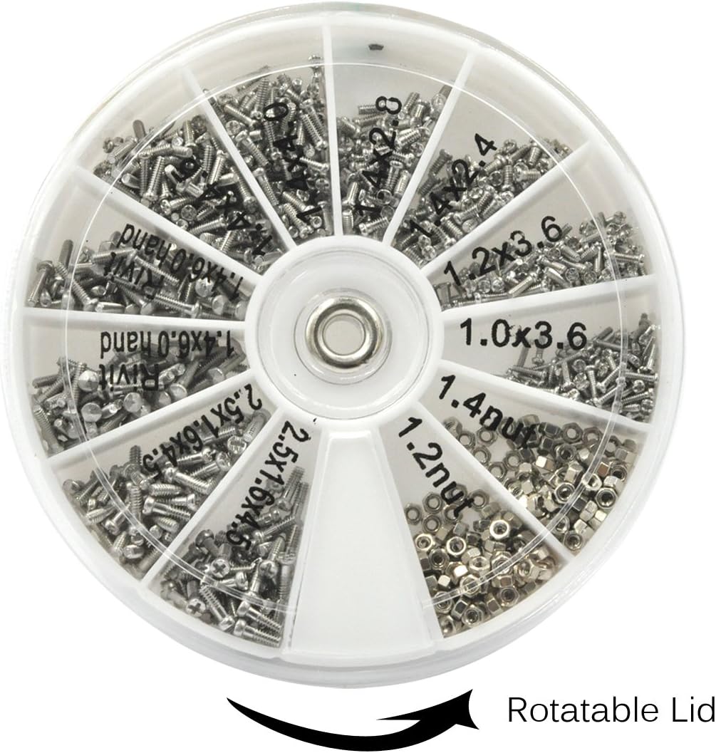 AVAILABLE IN VARIOUS SIZES — 12 Sorts of Small Stainless Metal Screws Electronics Assortment Package Software : M1.2 nut,M1.4 nut,screws M1 x 3.6,M1.2 x 3.6,M1.4 x 2.4,M1.4 x 2.8,M1.4 x 4.0,M1.4 x 4.5,M1.6 x 4.5 and M1.4 x 6 Rivit hand.For watches,glasses,electronics or anything restore that requires small screws.