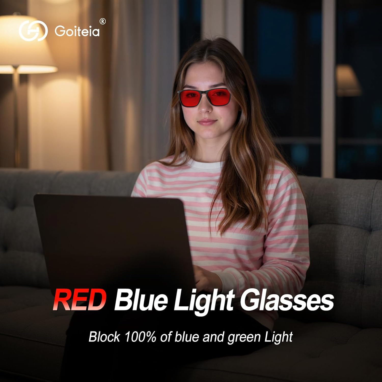 Goiteia red-tinted blue gentle blocking glasses are designed to enhance sleep and cut back gentle sensitivity by blocking 100% of blue and inexperienced gentle (380-500 nm). They promote pure melatonin manufacturing for higher sleep and a more healthy circadian rhythm. The superior anti-reflective coating reduces glare, offering clear imaginative and prescient throughout video calls, gaming, or streaming. Light-weight and sturdy with TR90 frames, metallic temples, and versatile hinges, they guarantee a snug match, particularly for bigger heads. Relieve eye pressure, complications, and fatigue with trendy, useful glasses excellent for prolonged display use!