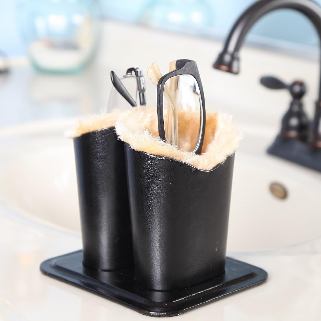 Home-X – Plush Lined Double Eyeglass Case & Holder, Intelligently Designed Protective Eyewear Case Offers Space for Two Eyeglasses, Rests Securely on Desk or Nightstand for Easy Access, Black