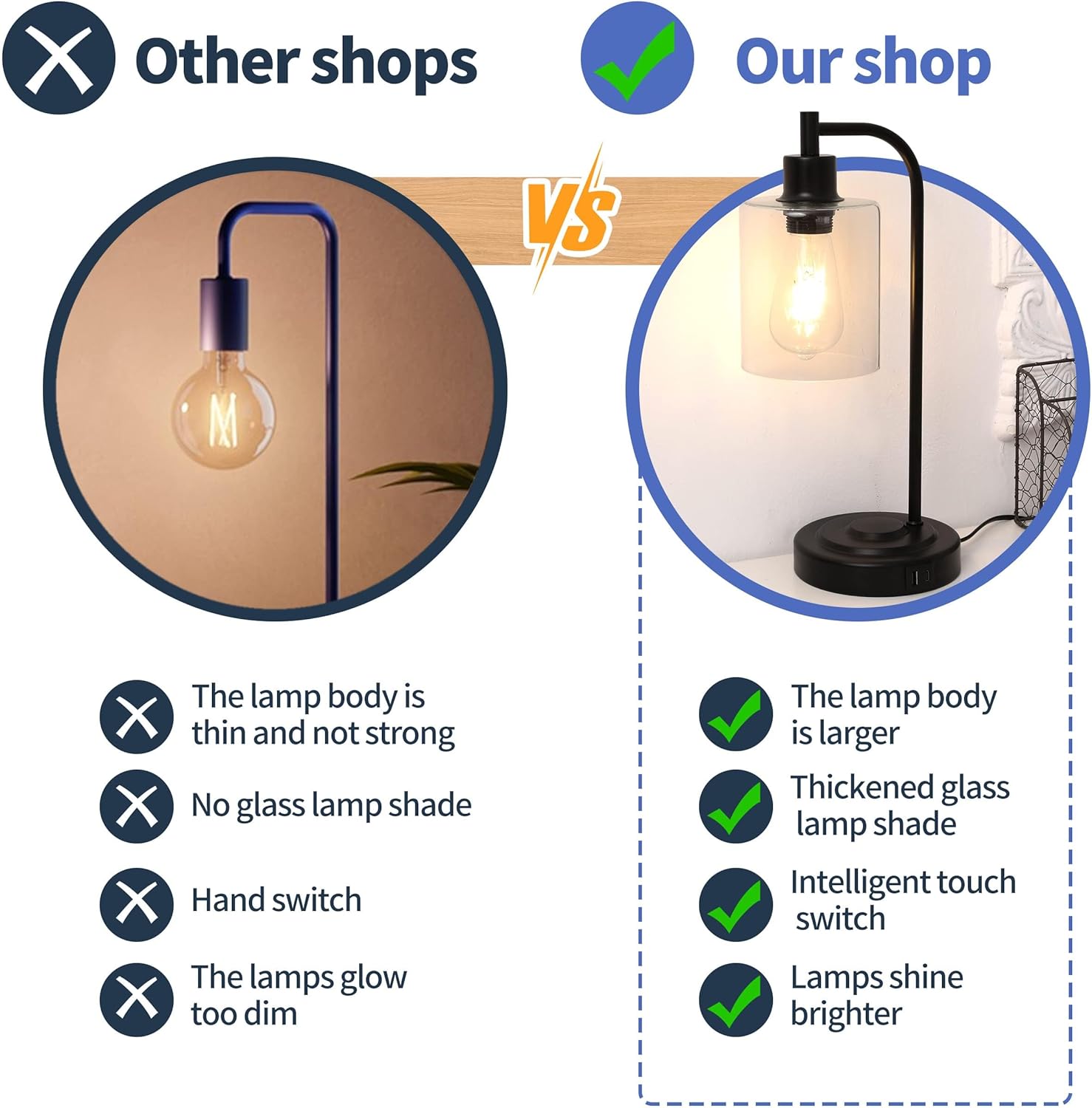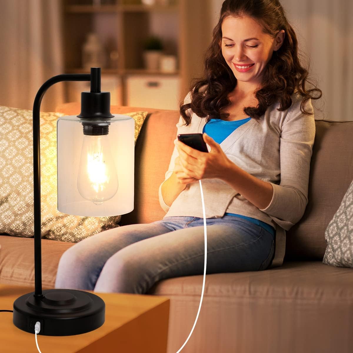 Industrial Style Touch Control Glass Table Lamp – Dual USB A+C Ports Charging Bedside Light, Adjustable Brightness Metal Base Lamp for Bedroom, Office, Living Room Nightstand
