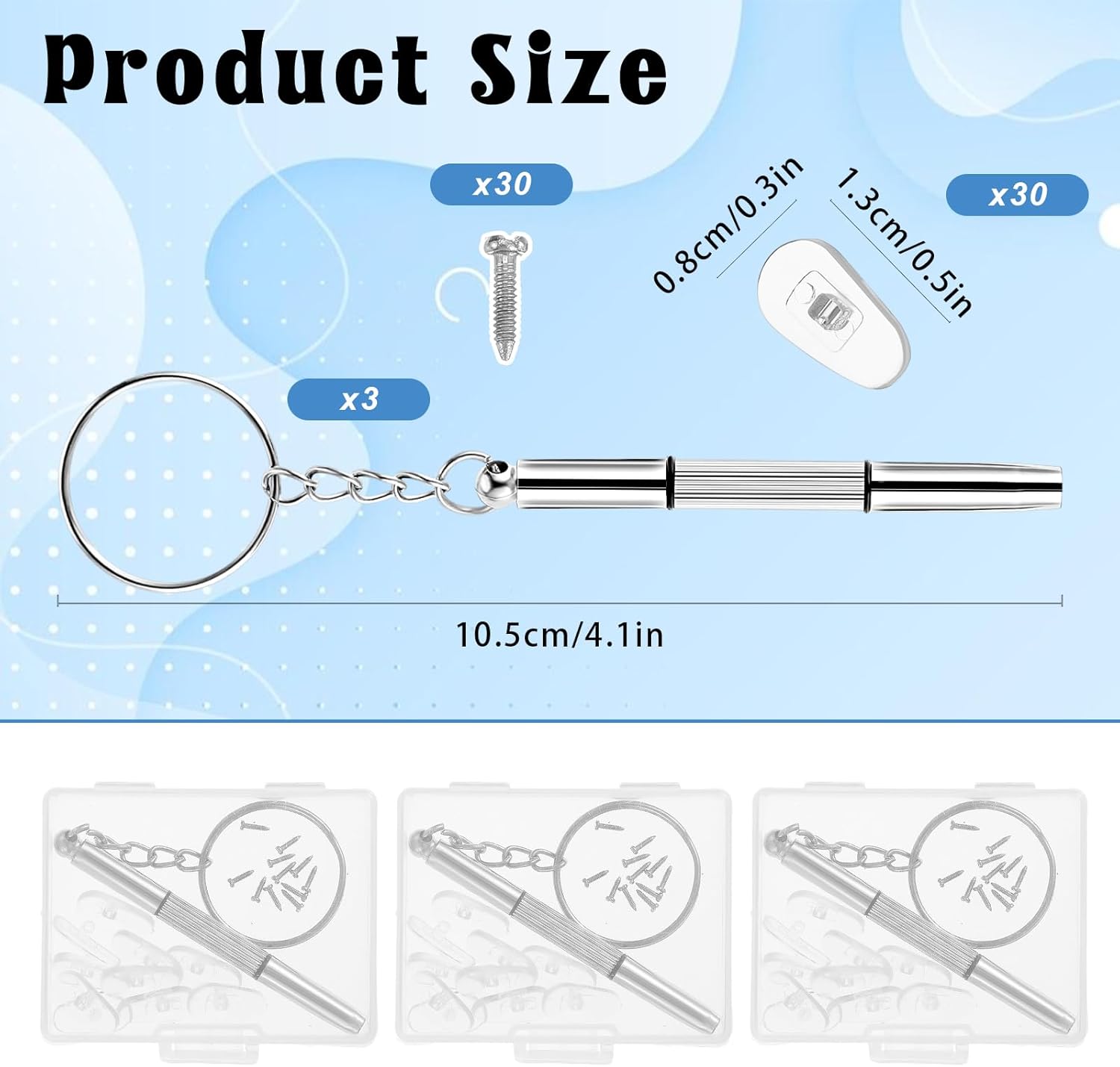 【Full Glasses Restore Set】The package deal contains three 3-in-1 multi-tool screwdrivers for glasses, every outfitted with a keychain. It additionally accommodates 30 pcs nostril pads and 33 common eyeglass screws, all neatly organized in three clear packing containers for handy storage and easy use. With a ample amount of parts, this set is designed for ease of use and is ideal for sharing with household and associates.