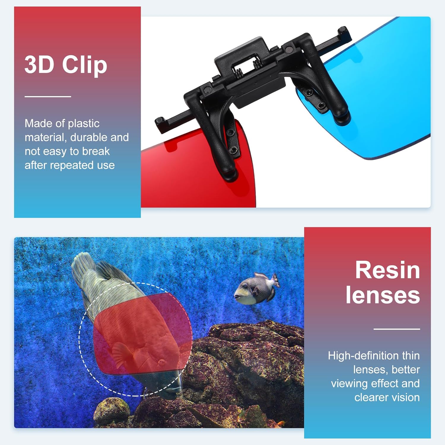 The 3D glasses clip-on is made of plastic material, which is durable, explosion-proof and drop-resistant, and has strong impact resistance. It can effectively prevent the lenses from breaking and scratching, greatly reducing the damage to the eyes, making it safer to wear and watch. The high-definition and thin lenses provide better viewing effects and clearer vision. They are easy to install and comfortable to wear.