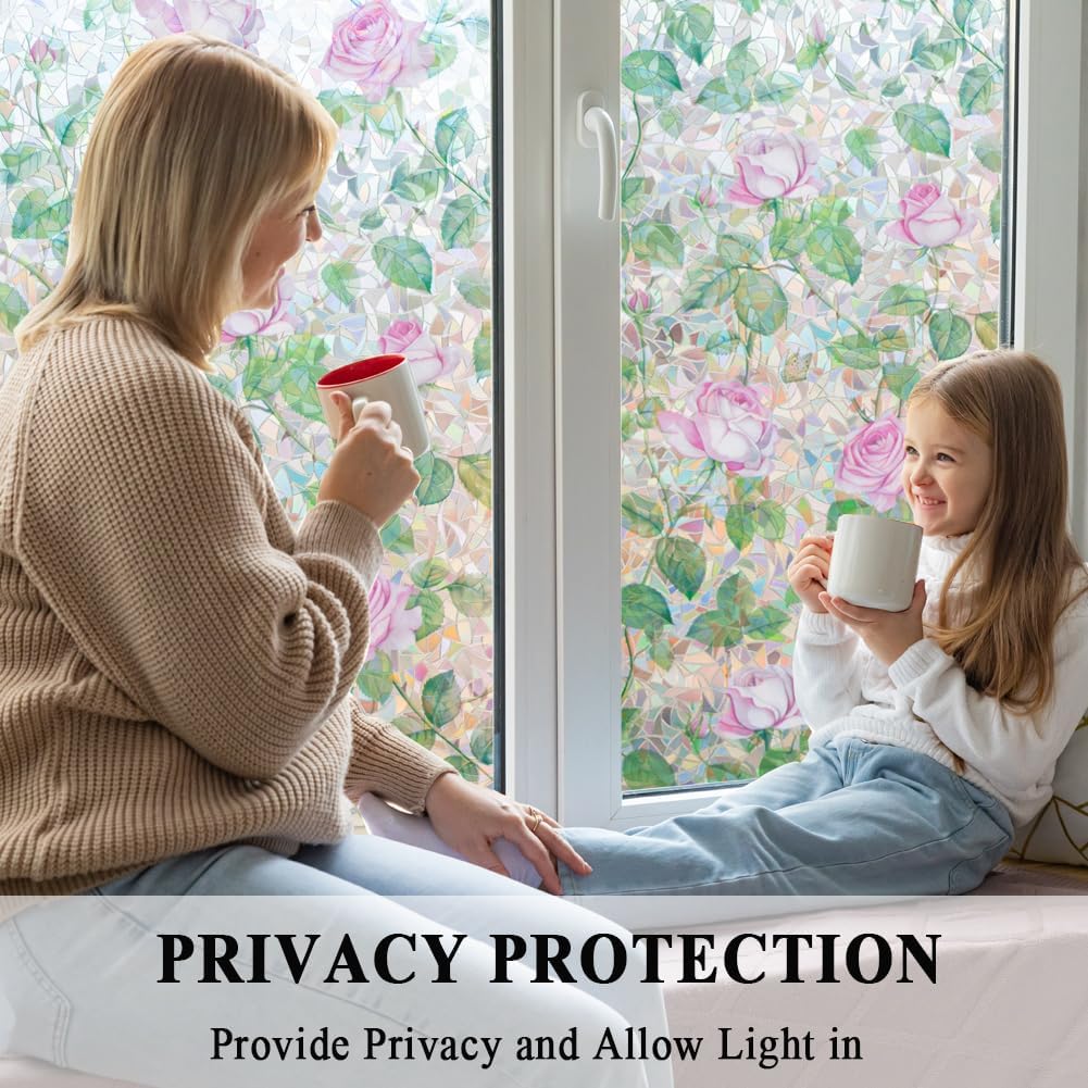 No Glue Window Film Pink Rose Rainbow Clings 3D Stained Glass Door Tint Covering Reusble Static Cling Decal for Home and Office,17.5 inches by 157 inches