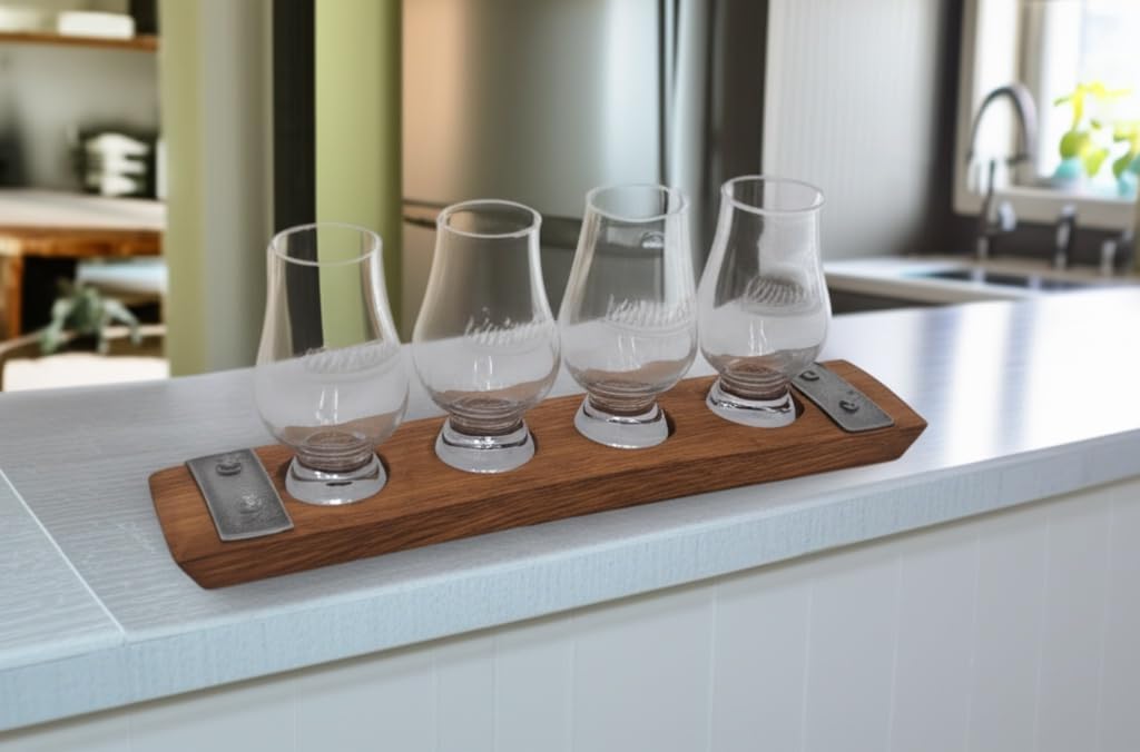 Personalized Laser Engraved Glencairn Glass Whiskey Flight Tasting Board Holder 3, 4 or 5 Made from a Kentucky Bourbon barrel stave (Glasses Not Included)(4 Glass English Chestnut)