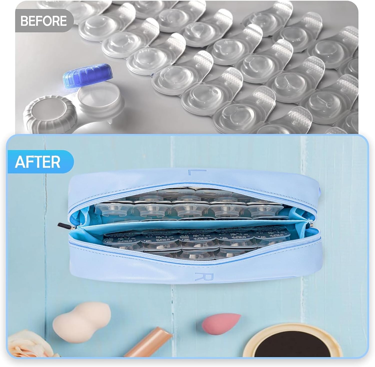 Portable Daily Contact Lens Organizer Case, Disposable Contact Lens Dispenser, Travel Contact Lens Storage Case with Labeled R & L, Double Zipper, Storage up to 60 Lenses (Blue)