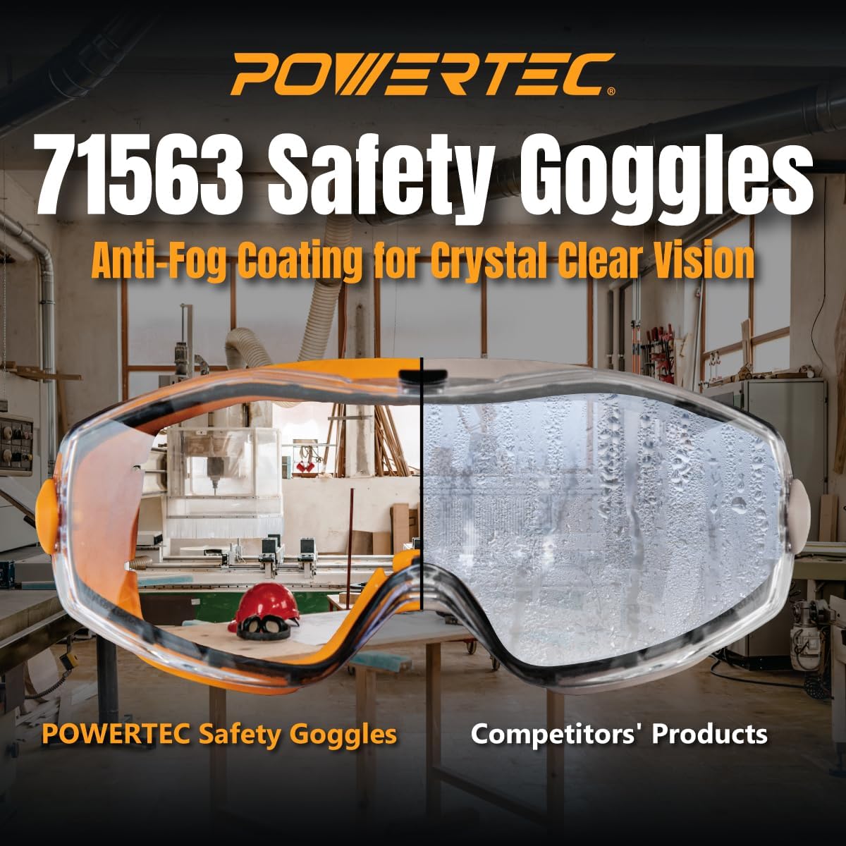 POWERTEC Safety Goggles Over Glasses, Scratch Proof UV Protection Anti-fog Safety Goggles, Chemical Splash Protective Eyewear W/Adjustable Headband for Woodworking, Mowing, Construction (71563)