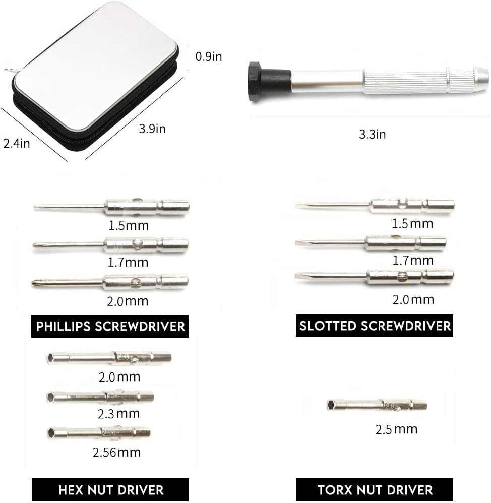 10-Fashion Screwdrivers: 3PCS Slotted screwdrivers (1.5/1.7/2.0), 3PCS Phillips screwdrivers (1.5/1.7/2.0), 3PCS Hex nut screwdriver (2.0/2.3/2.56), 1PCS Torx nut screwdriver (2.5) are packaged in a beautiful field for various screws. If you need to change the bits, push them in earlier than you pull them out