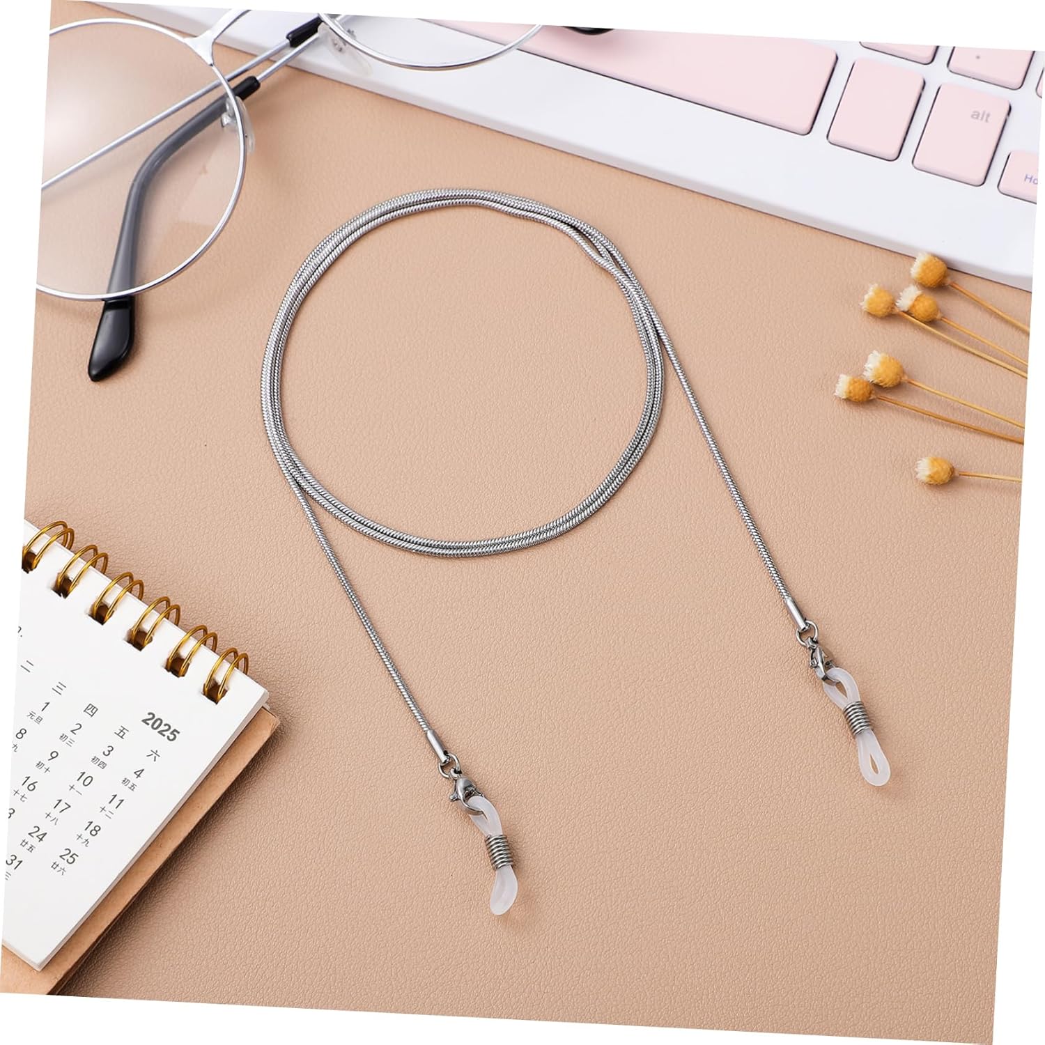 – Adjustable silver rubber ends with metallic coils eyeglass chain.