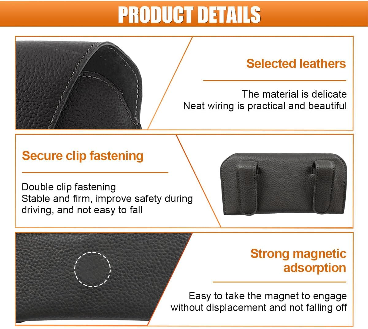 【Excessive-High quality Materials】: This automobile solar visor sun shades holder is manufactured from high-grade leather-based, which is delicate and clean, is not going to harm automobile elements, has no peculiar odor, with neat stitching, is hard and wear-resistant, impact-resistant, and never simple to scratch or deform. Its internal flocking lining can shield your sun shades from scratches and abrasions. The luxurious and delicate texture can improve the fashion of the automobile inside.
