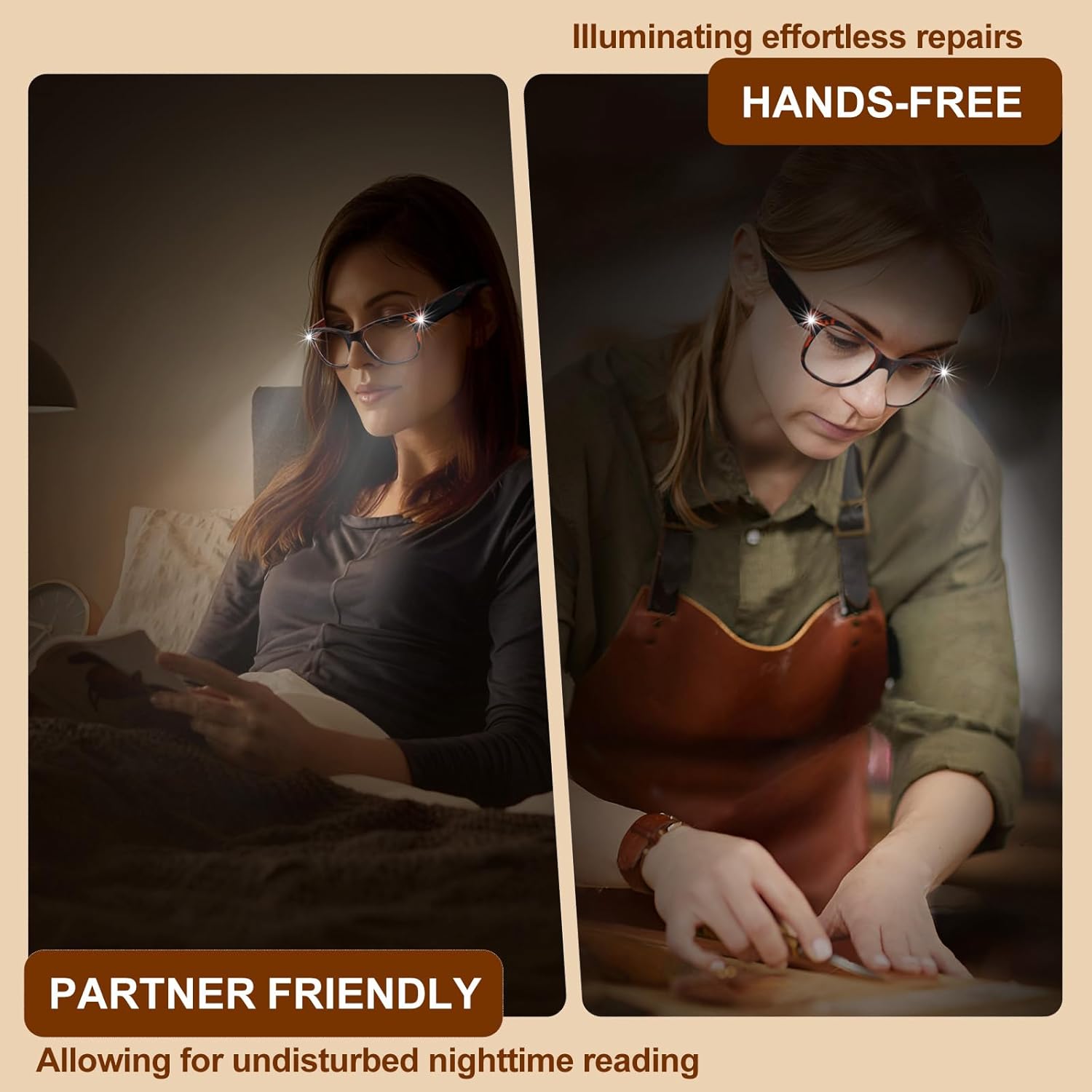 Including LED lights to the readingglasses, nice for studying in poor gentle or resting in mattress.